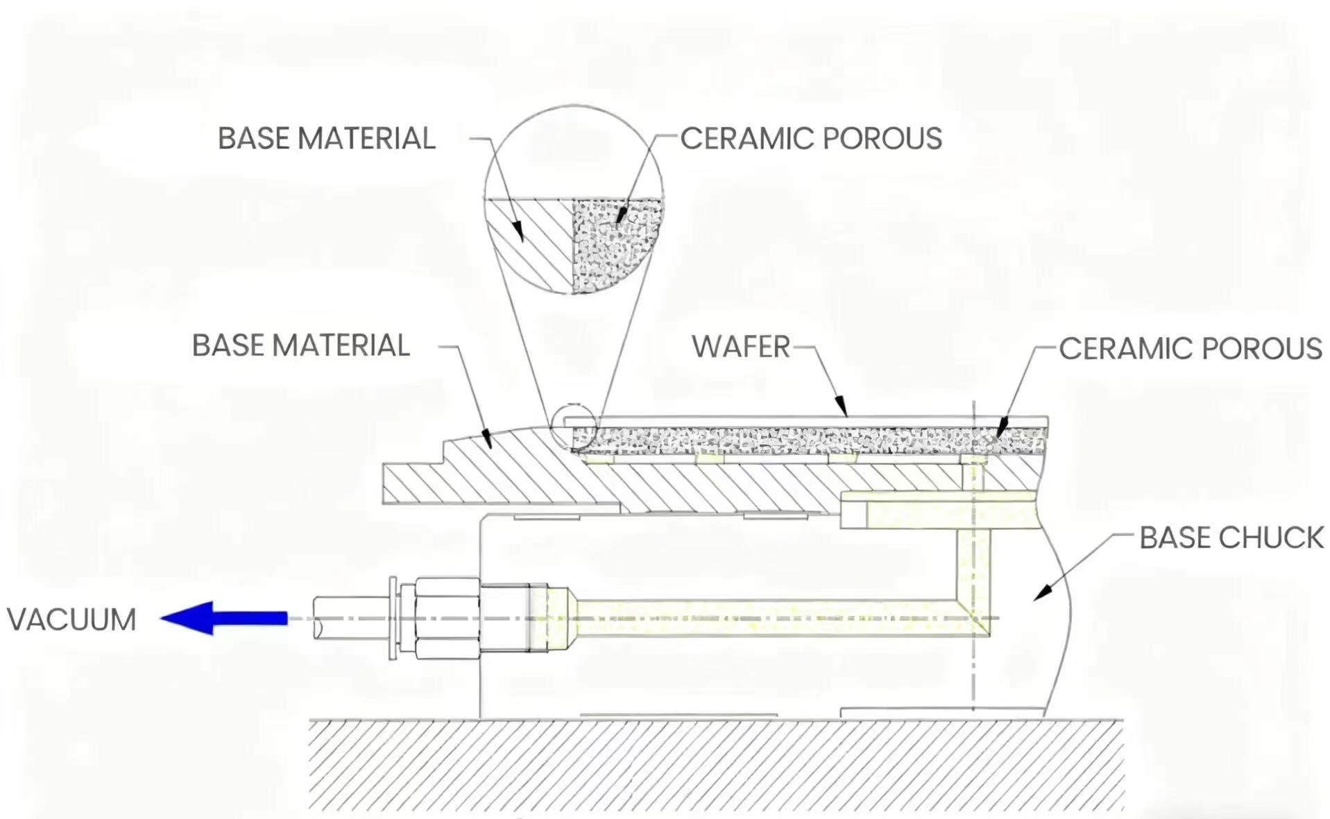 اپنی مرضی کے مطابقغیر محفوظ سیرامک چکبیس اور غیر محفوظ سیرامک پلیٹ پر مشتمل ہے۔ ویکیوم سسٹم سے منسلک ، کم دباؤ کا ماحول ویفر اور سیرامک کے مابین ہوا کو خالی کرکے پیدا کیا جاتا ہے۔ ویکیوم منفی دباؤ کے تحت ، ویفر کو مضبوطی سے چک کی سطح پر قائم رہتا ہے ، بالآخر محفوظ اور مستحکم فکسنگ اور پوزیشننگ کو حاصل کرتا ہے۔