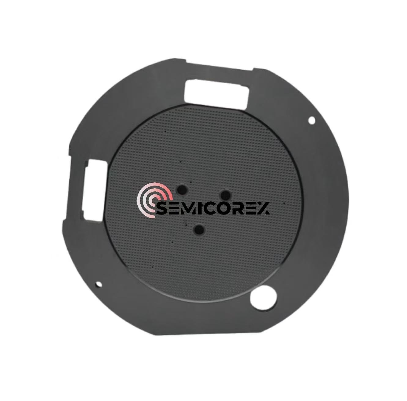 درستگی سے چلنے والے مائیکرو سوراخوں کو SiC سیرامک ویکیوم چک کی سطح پر یکساں طور پر تقسیم کیا جاتا ہے، جس سے بیرونی ویکیوم آلات سے قابل اعتماد کنکشن ہوتا ہے۔ آپریٹنگ کے دوران، ویکیوم پمپ کو سوراخوں کے ذریعے ہوا کھینچنے کے لیے چالو کیا جاتا ہے، جس سے سیمی کنڈکٹر ویفر اور ویکیوم چک کے درمیان منفی دباؤ کا ماحول پیدا ہوتا ہے۔ لہذا یہ ویفر کو ویکیوم چک کی سطح پر یکساں اور مضبوطی سے تھامے رہنے کی اجازت دیتا ہے۔